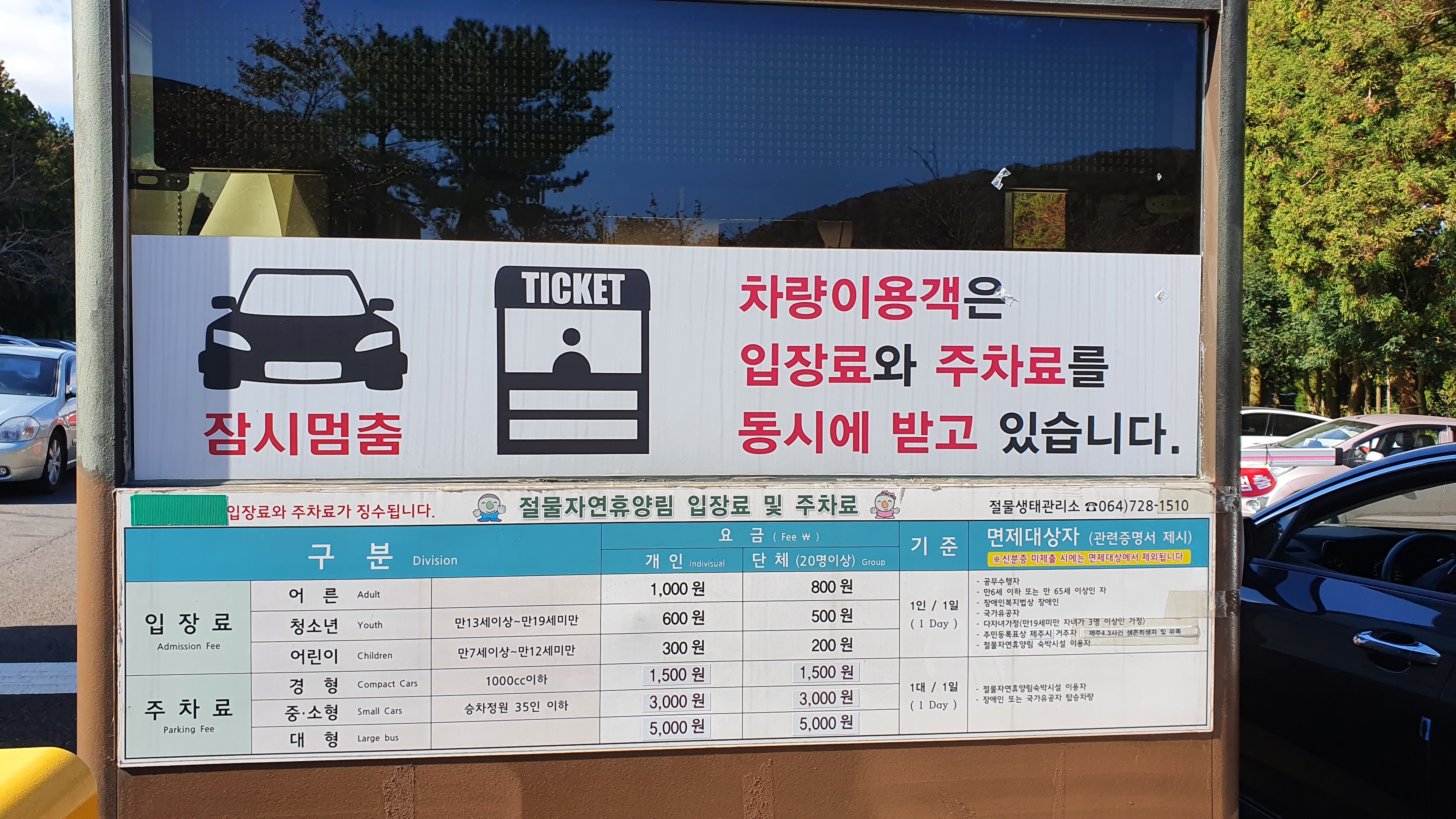 절물자연휴양림 주차비와 입장료는 사진 참고해보세요~ 차량을 이용해 방문하시면 주차시 입장료도 함께 결재해야하니 미리 준비하세요~