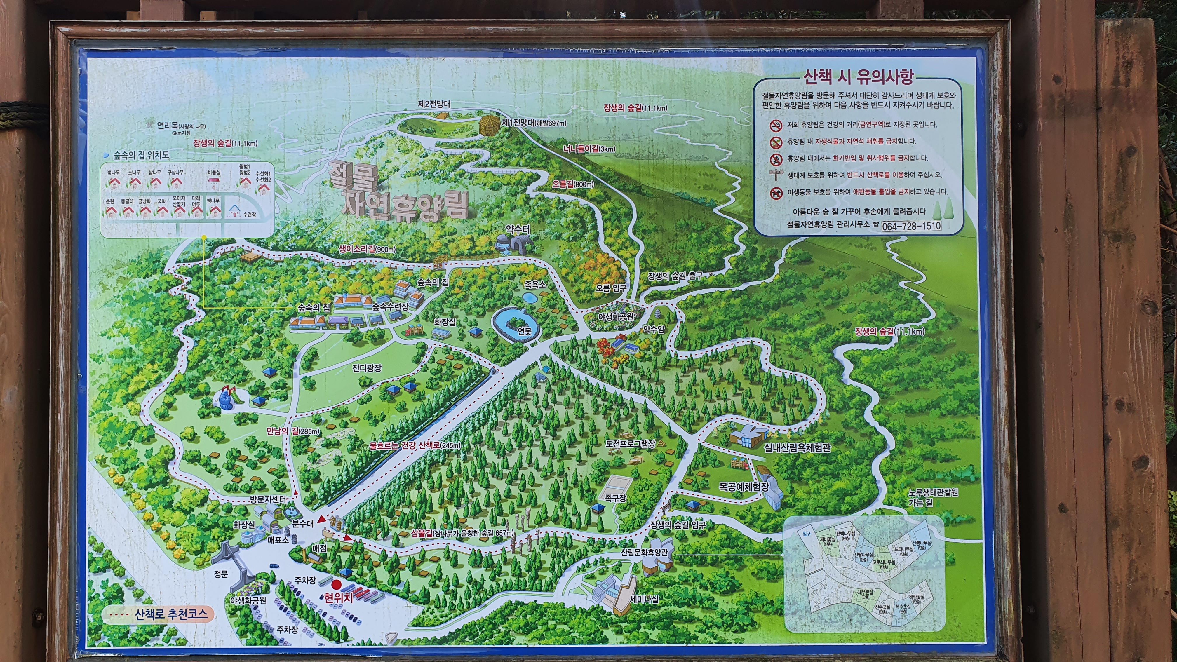 절물자연휴양림안에는 트레킹코스가 여러개가 있어서 방문 목적과 체류시간에 따라 선택해서 걸을 수 있는데 가장 긴코스인 장생의 숲길(11.1km)과 절물오름을 오를 수 있는 오름코스, 그리고 산책로 추천코스도 있습니다.