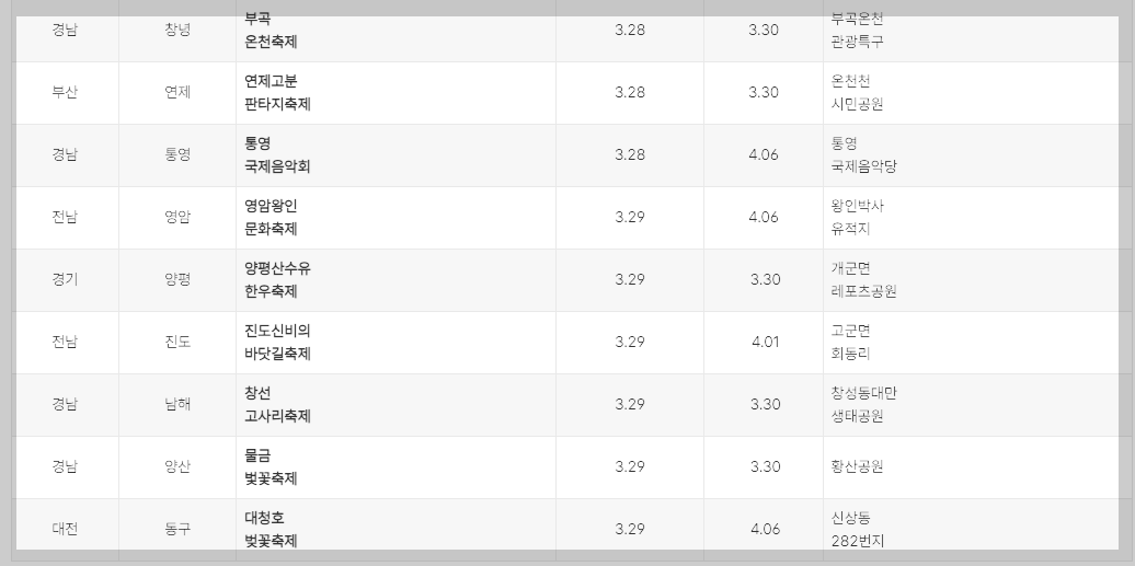 특히 벚꽃 축제, 튤립축제, 수선화 축제, 매화 축제, 진달래 축제 등등 다양한 꽃 축제들이 열려서 전국에서 꽃 잔치를 펼지게 되는데요..