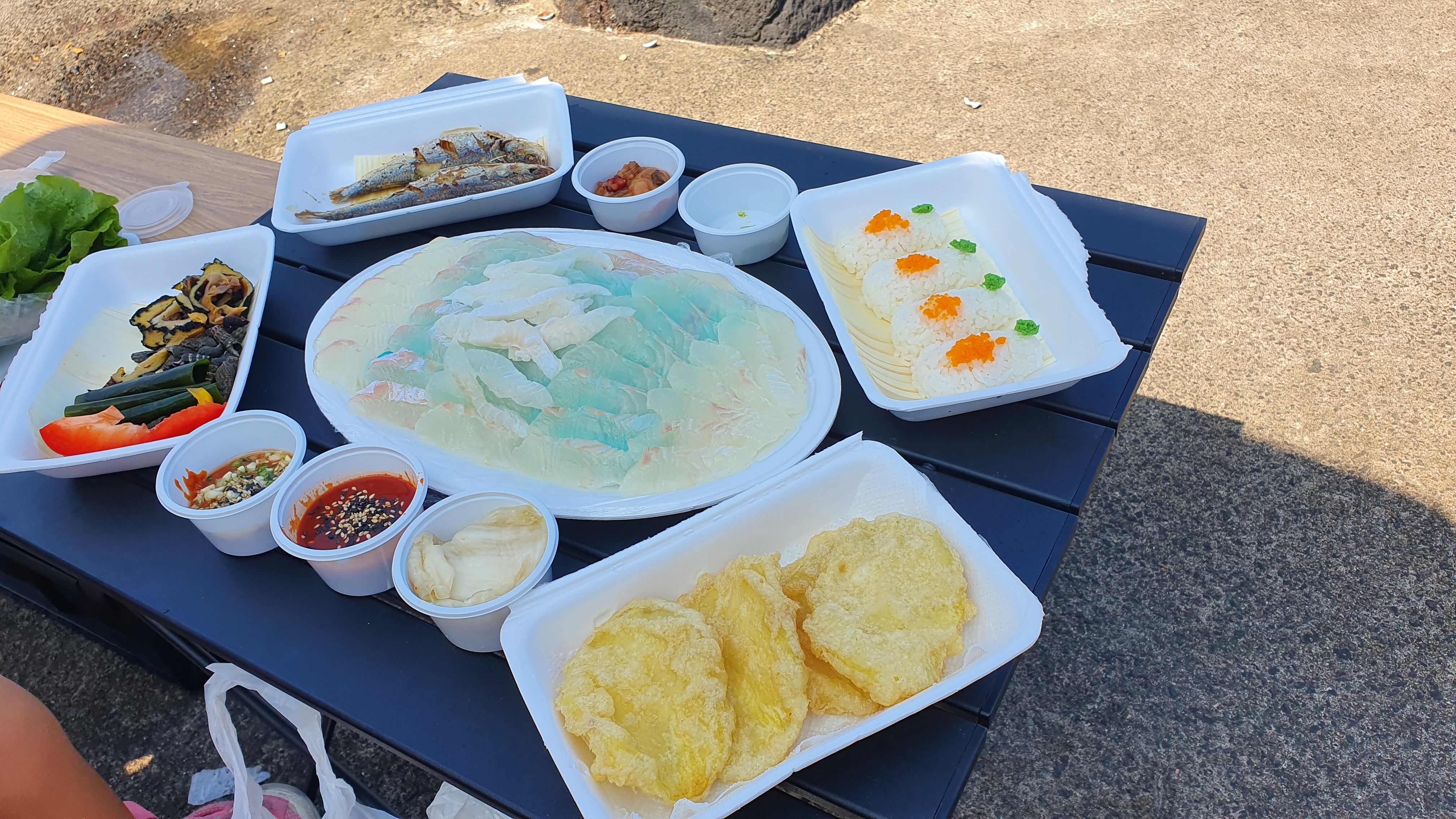 세회해변 근처에 차를 세워놓고 테이블을 편뒤.. 포장한 회를 셋팅해 봅니다. 나름의 스끼다시도 제공해주는데 이번에는 전어구이도 함께 나왔네요, 초밥을 만들어 먹으라고 밥과 날치알 와사비가 셋팅된 미완성 초밥이 있는데 저기에 회를 올려먹으면 회가됩니다만, 초밥을 만들어 먹으면 맛은 그닥!! 회를 그대로 즐기는것이 좋은것 같습니다^^